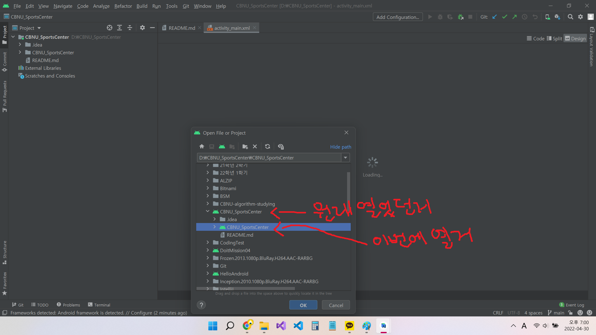 안드로이드프로젝트 하위폴더를 열어주었다