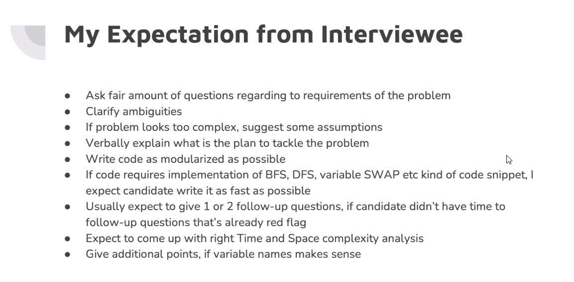 - 면접자가 1,2개의 follow-up 질문을 해야하는데 할 시간이 없으면 적신호다(?)