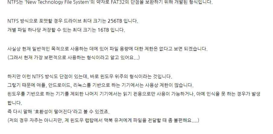 NTFS는 FAT32의 단점(4GB이상 못옮김)을 보완한 파일시스템 포맷이라고한다