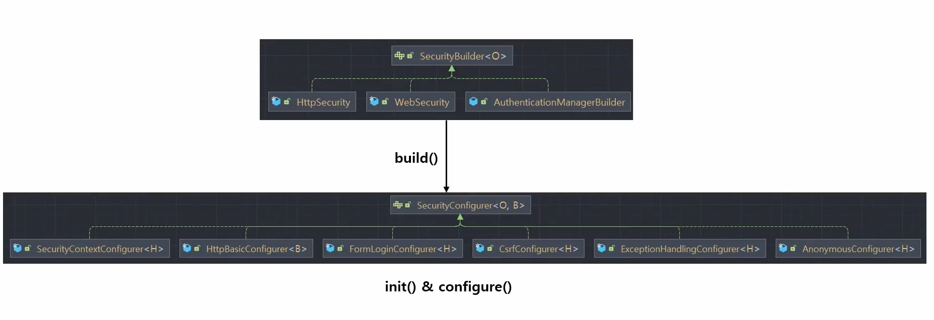 - SecurityBuilder는 SecurityConfigurer를 포함하고 있으며 인증 및 인가 초기화 작업은 SecurityConfigurer에 의해 진행된다.