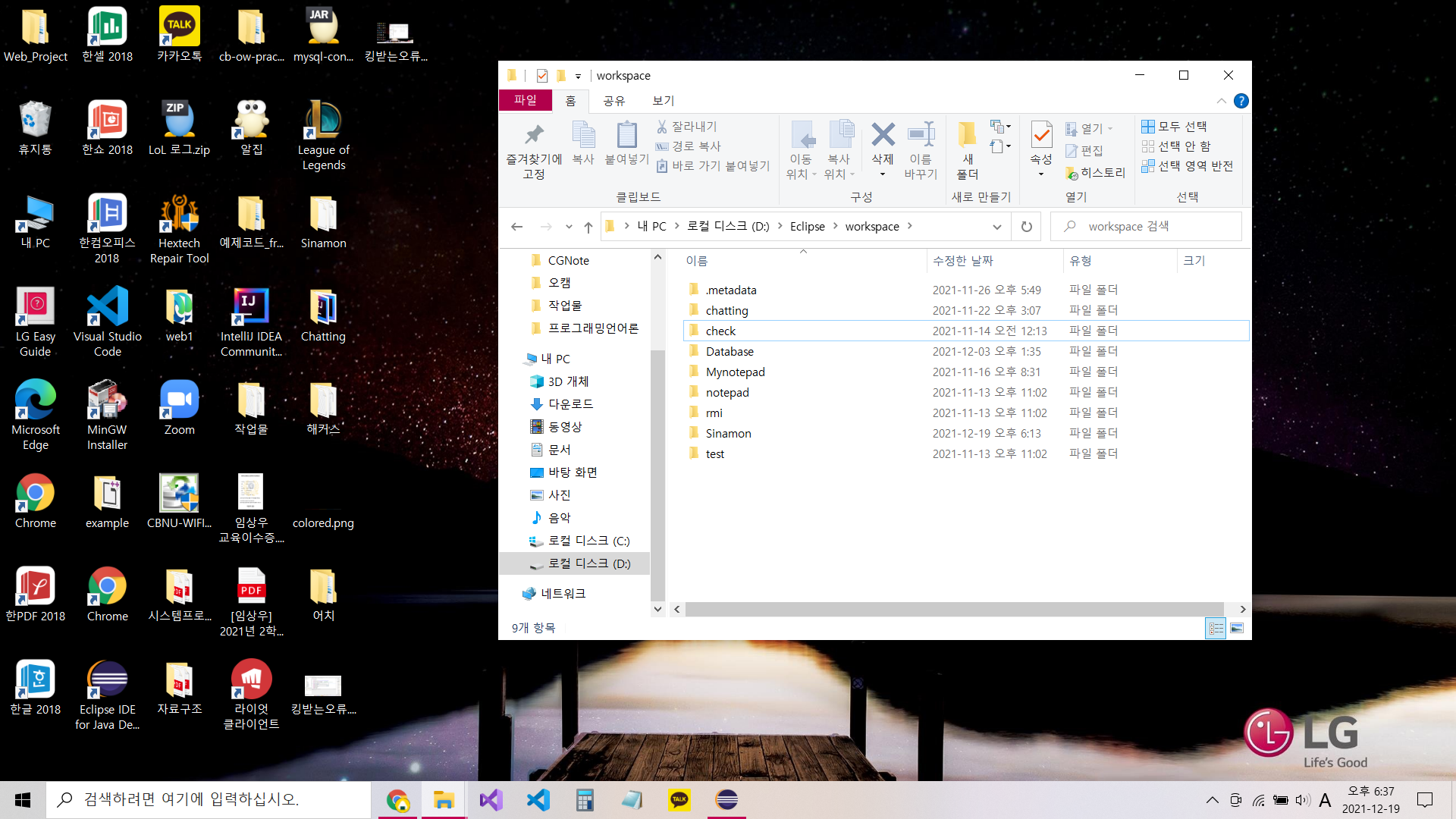 그런데 나의 이클립스 작업환경은 d드라이브 -> Eclipse -> workspace다