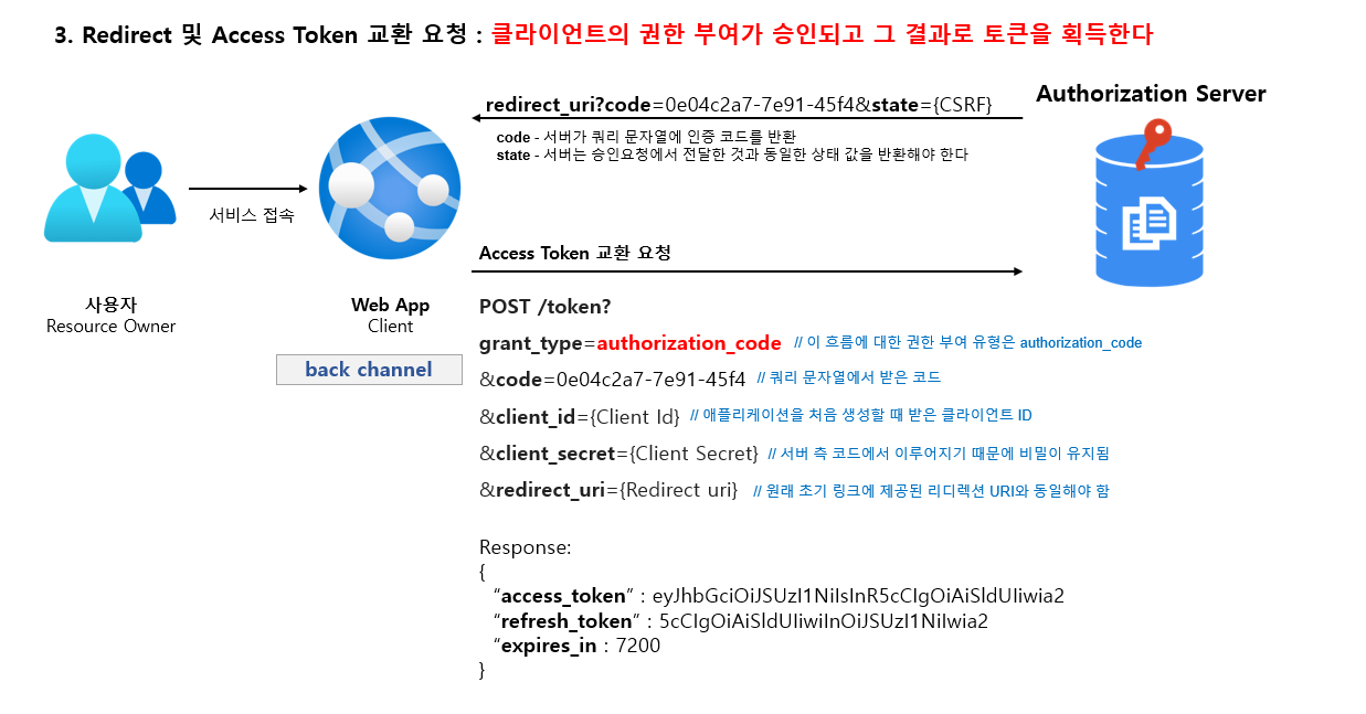 - 사용자가 응용 프로그램을 성공적으로 승인하면 권한 부여 서버가 사용자를 다시 응용프로그램으로 리디렉션한다