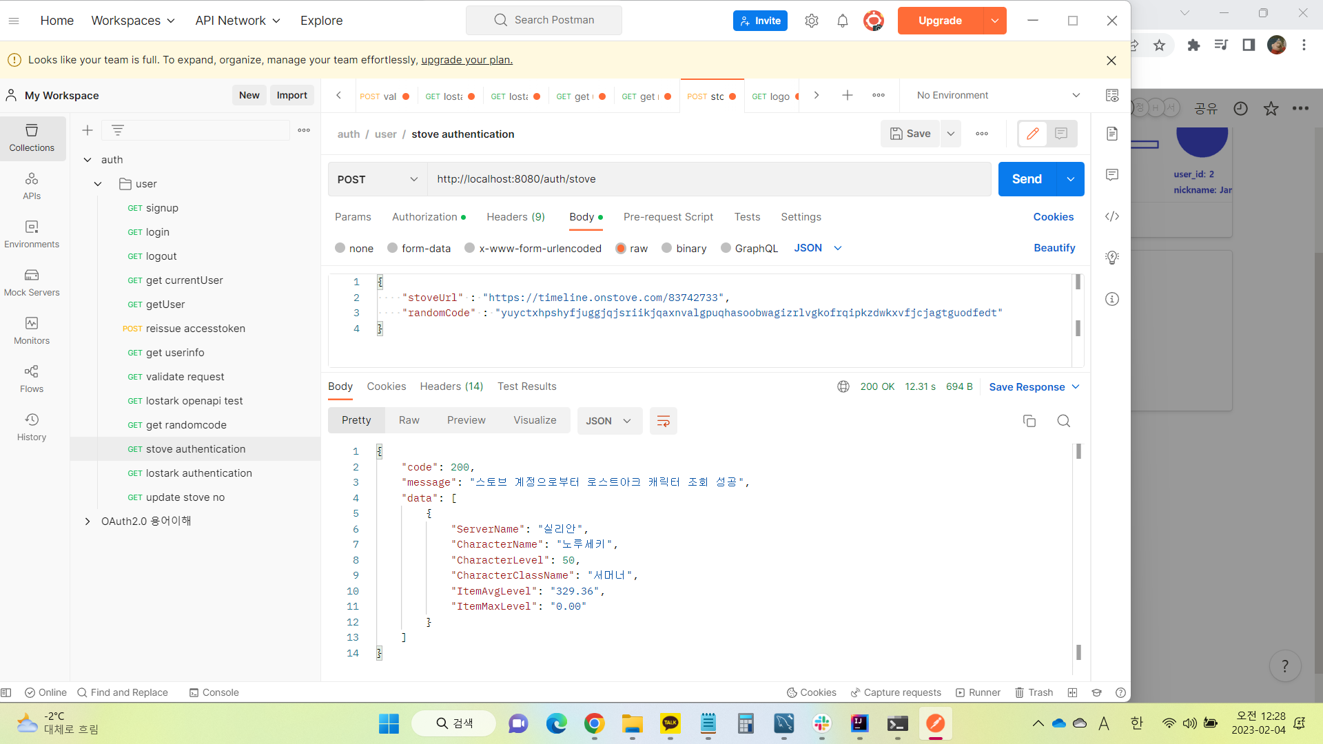 이로써 로컬에서는 스토브계정으로부터 로스트아크 캐릭터를 조회하는데 성공했지만,