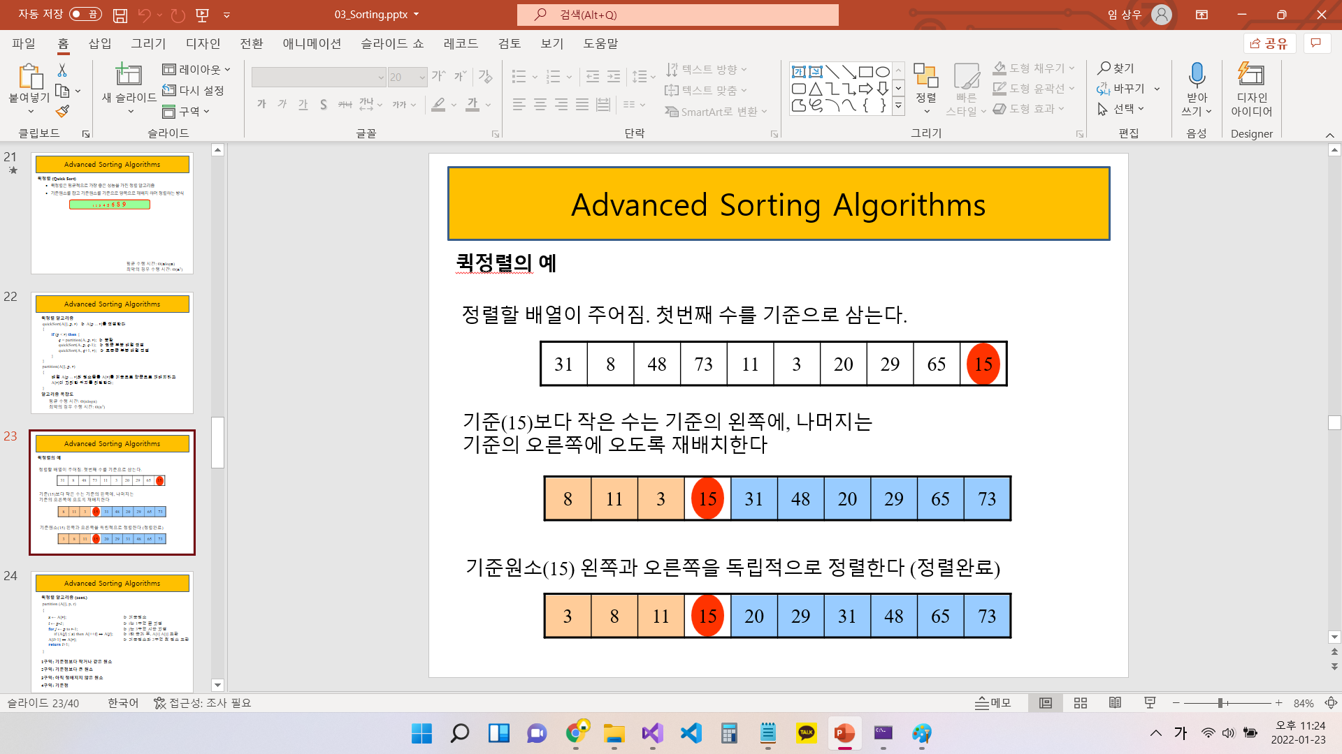 quicksort(start, j-1) //pivot기준 왼쪽 다시 퀵소트