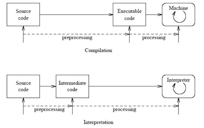 - 컴파일러는 소스코드 전체를 훑고 컴퓨터 프로세서가 실행 할 수 있도록 바로 기계어로 변환한다. 인터프리터는 고레벨 언어를 중간 코드로 변환하고 이를 각 행마다 실행한다. 이 중간 코드는 다른 프로그램에 의해 실행된다.