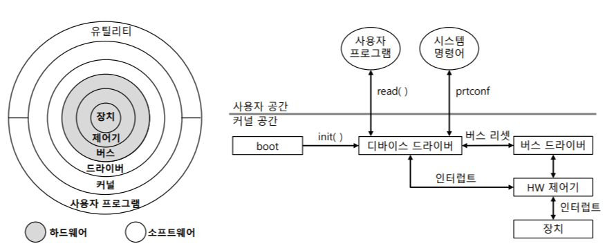 - 입출력 장치별로 각각 디바이스 드라이버가 커널에 통합되어 실행