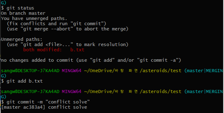 그러면 b.txt를 다르게 수정해서 conflict가 날것이고 이걸 해결하도록 해보겠다