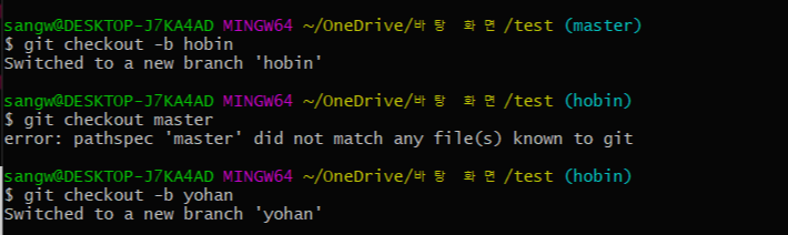 가장 최근에 체크아웃한 브랜치는 master이므로